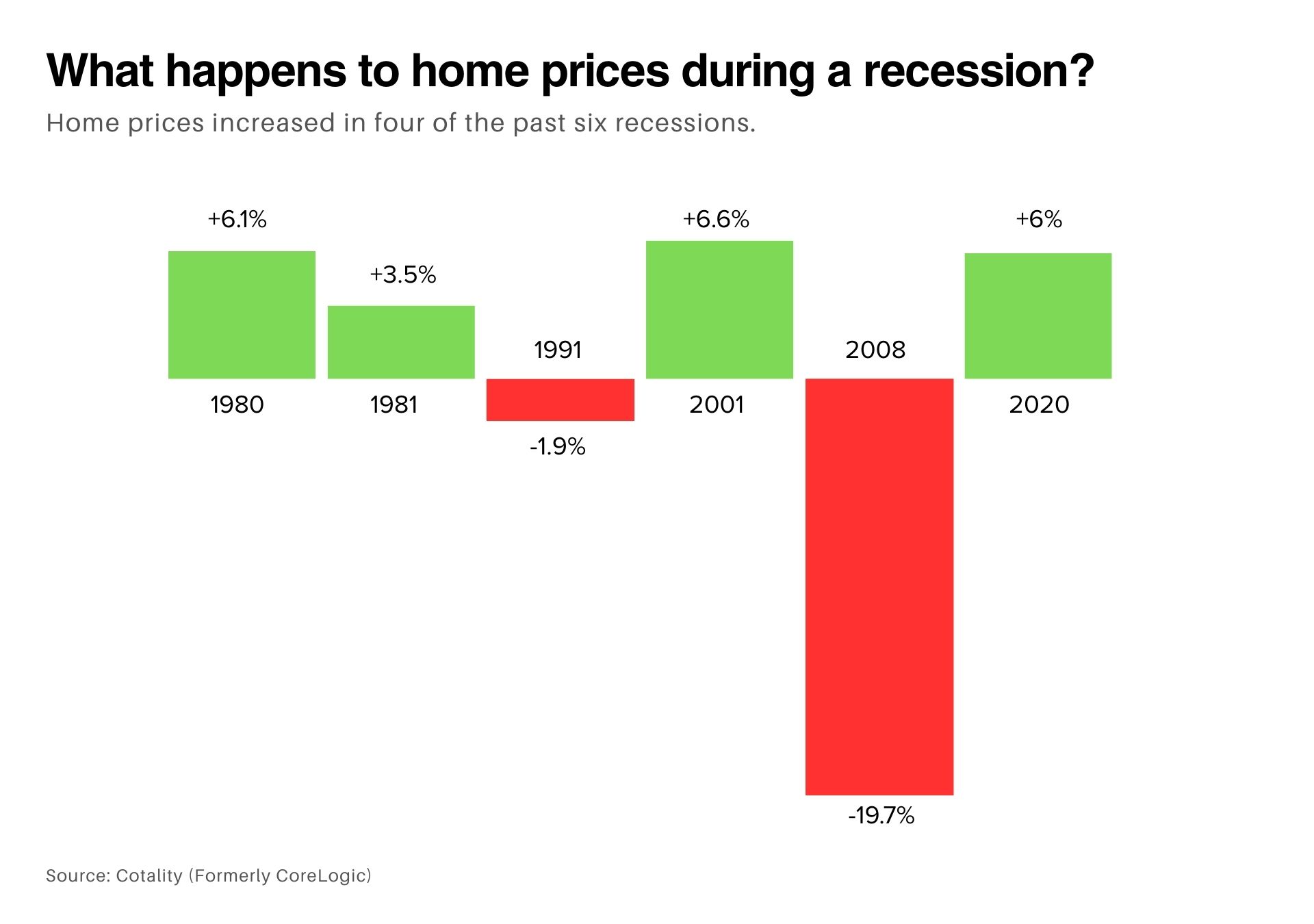 In fact, during 4 of the last 6 U.S. recessions, home prices went up. The only major drop happened during 2008's housing crisis, which was caused by risky lending, overbuilding, and a financial meltdown—none of which mirror today's market conditions.