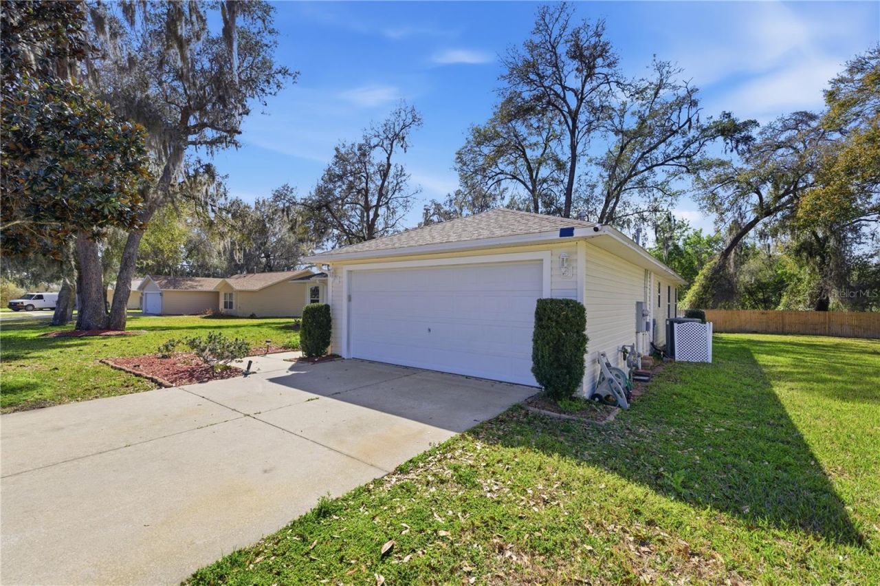 Well cared for and hard to find 4 bedroom, 2 bath home in a fantastic location! This move-in-ready property features a spacious living/family room with soaring vaulted ceilings and beautiful wood flooring throughout all living areas and bedrooms. The kitchen shines with stainless steel appliances, maple cabinets, and granite countertops, perfect for both everyday living and entertaining. Sliding glass doors with built-in blinds lead to a screened-in lanai overlooking the oversized, privacy-fenced backyard.The primary suite offers a large walk-in closet and an updated bathroom with granite countertops and a custom tiled walk-in shower. A desirable split floor plan places the three additional bedrooms and second bath on the opposite side of the home for added privacy. Additional highlights include a large laundry room with extra storage and a deep two-car garage with built-in storage. Situated on a quiet dead-end street with no through traffic in a great family neighborhood.Conveniently located near The Villages, plus close to shopping, dining, entertainment, schools, hospitals, and everyday amenities.Don't miss this move-in ready gem!Roof 2018AC 2022 - Trane 3.5 ton 16 Seer with transferable warranty for $99