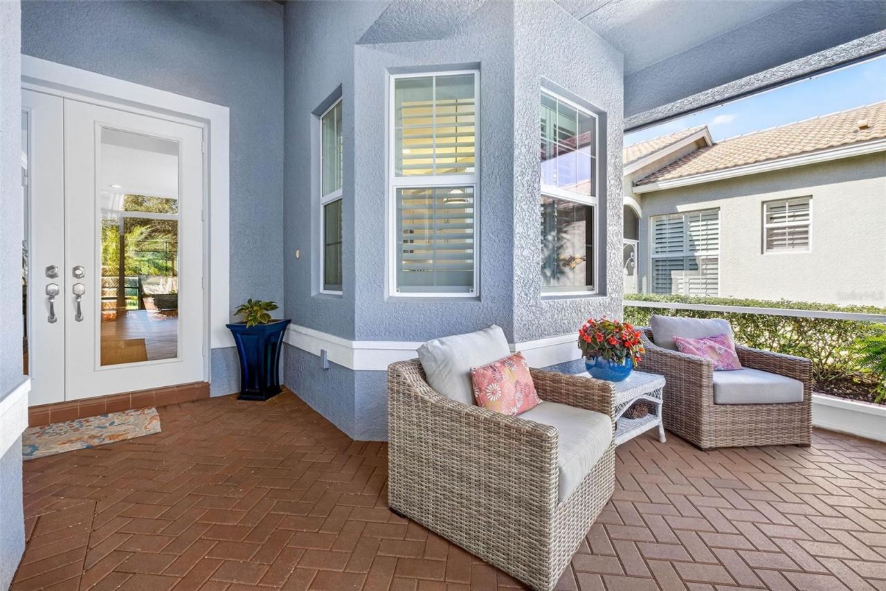 Beautifully appointed modified Capri floorplan that truly shows like a model. Enjoy morning coffee on the spacious front porch before stepping inside to a thoughtfully redesigned, wide-open layout. The kitchen wall was removed to create an expansive living space featuring elegant crown molding and ceiling d?cor, staggered cabinetry with crown molding, quartz countertops, herringbone tile backsplash, a lighted glass-front cabinet, above and below-cabinet lighting. A cozy breakfast nook with bow windows and stainless steel KitchenAid appliances completes the space. The great room is highlighted by a custom-built-in entertainment wall with a fireplace and illuminated art niches. A spectacular office offers built-in shelving, a decorative accent wall, and a closet, making it ideal as a flex space. Plantation shutters enhance the home throughout. Relax on the screened rear lanai with custom shades overlooking a private backyard.Additional features include a Culligan water softener, a water heater approximately 3 years old, an epoxied garage floor, and ceiling-mounted storage.Beautifully appointed modified Capri floorplan, shows like a model. Enjoy your morning coffee on the spacious front porch. The kitchen wall was removed to open the kitchen, giving a wide open floor plan, elegant crown molding and ceiling d?cor, crown molding on staggered kitchen cabinets, Quartz counters, herringbone tile backsplash, lighted glass cabinet, above and below cabinet lighting, cozy breakfast nook with bow windows, Stainless Steel KitchenAid appliances. The great room features a custom-built-in entertainment wall featuring a fireplace and lighted art niches, a spectacular office with built-in shelves, decorative wall and closet, Plantation shutters throughout the house, screened rear lanai with custom shades overlooking a private back yard. Culligan water softener, water heater 3 yrs old. Epoxied garage floor, hanging storage from the ceiling.