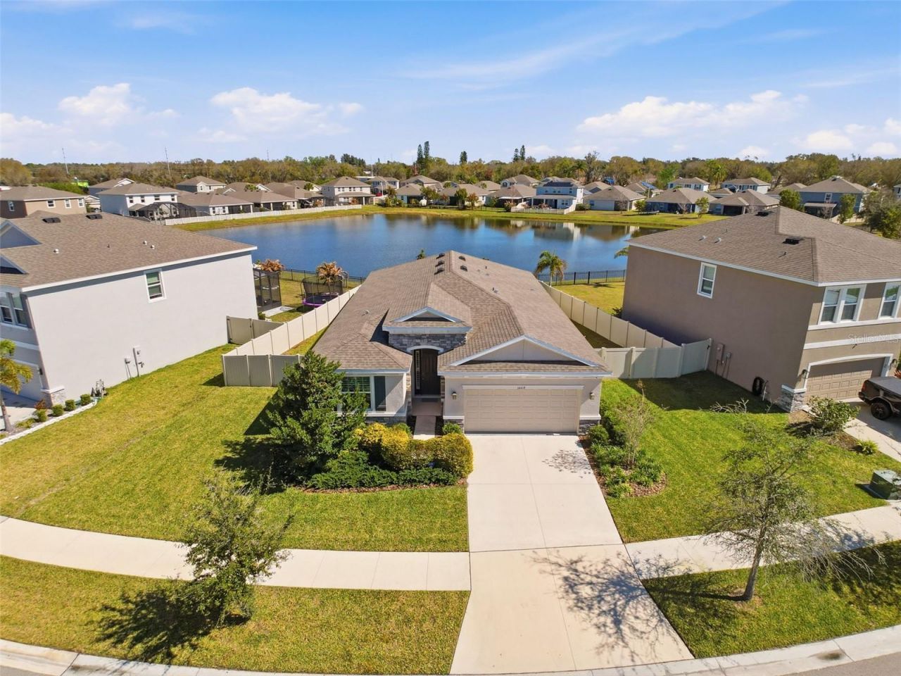 Welcome Home is what this home says to you! Built in 2023, this contemporary home in Southshore Bay is light, airy, and move-in ready! You'll enjoy a sense of flowing space of this 4-bedroom , 2.5-bathroom and 2-car garage D.R. Horton Preferred Series Lantana home, showcasing lofty 9'4 ceilings, 42' staggered mount kitchen cabinets with brushed satin hardware and crown molding, granite countertops throughout, stainless steel appliances, shower wall tile, and Home is Connected Smart Home System. In addition, this well designed home sits in a premium lot with a pond view, fenced-in yard and beautiful landscaping. Added features include luxurious Plantation shutters and elegant chandeliers in foyer, kitchen island and dining area and is equipped with a security system. Watch the beautiful sunrise and enjoy the pond view in your screened-in lanai. Southshore Bay is a gated resort style community where residents enjoy its 5-acre crystal MetroLagoon, providing a myriad of water activities for all ages, including family beach, splash pad, super-slide, paddle board and kayak, cabana and tiki, hub event pavilion and more! the community HOA assessments also include ULTRFI, bundling internet and Spectrum Cable TV.