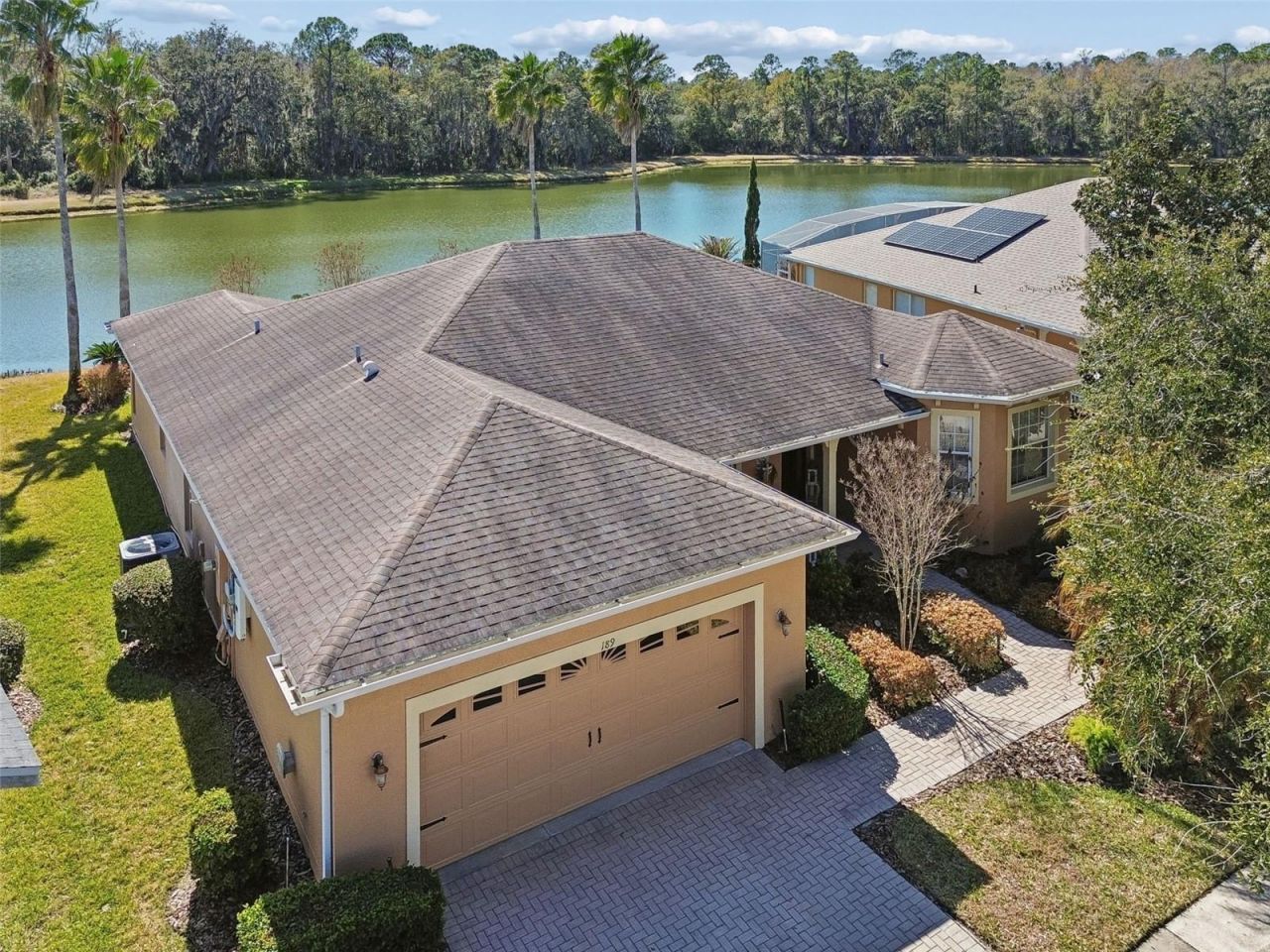 Gorgeous WATERFRONT Carnegie model with SUNROOM addition and OPEN-AIR covered and screened lanai where you can take in STUNNING VIEWS of both water and conservation, creating the ideal PRIVATE LOT. NEW ROOF COMING SOON! Step into this beautiful home featuring CERAMIC TILE laid on the diagonal in the living room and CROWN MOLDING throughout. The kitchen showcases 42-inch cabinetry with glass fronts, convenient DRAWER STORAGE, EXTENDED CABINETRY for additional space, built in WINE RACK, DECORATIVE HOOD above the microwave for an elegant touch, tumbled stone backsplash, and CORIAN counters. Photovoltaic SOLAR PANEL system installed in 2020 provides energy savings for the new owner with a transferable lease ($78 a month), allowing the buyer to benefit from reduced utility costs from day one!! Enjoy outdoor living on the 24 x 13 SCREENED, covered, and EXTENDED lanai ADDED in 2020, with beautiful views and complete privacy-no homes directly behind, just nature and open-air tranquility in a peaceful setting. The spacious PRIMARY SUITE occupies its own private side of the home and boasts a TRAY CEILING, engineered hardwood floors, linen closet, TWO WALK IN CLOSETS, and FRENCH DOOR access to the sunroom. The attached ENSUITE BATHROOM features a soaking tub, separate WALK-IN SHOWER, split vanities with DUAL SINKS, and a private commode. The TILED SUNROOM provides additional living space and is perfect for entertaining while still enjoying the gorgeous water and conservation views. The family room features double-door entry, LAMINATE FLOORS, and PLANTATION SHUTTERS, and is currently being used as a third bedroom option. In addition, the second bedroom is located just off the kitchen and includes an adjacent full bath, making it ideal for guests. THE HVAC was REPLACED in 2023 and the EXTERIOR of the home was painted in OCTOBER of 2025. Separate laundry room with additional storage cabinets, closet pantry and WASHER AND DRYER which are included in sale. Don't miss your chance to experience the lifestyle you deserve - schedule your private showing today! The HOA: - maintains the LANDSCAPING & IRRIGATION systems in the common areas as well as at individual homesites - maintains the roads throughout the community - PROVIDES SECURITY with gate guards and mobile patrols including the Polk County Sheriff - allows AUTOMATED GATE ACCESS for residents via license plate readers - provides residents with Fiber Optic Internet & TV service.***Poinciana Lakes Plaza is a MAJOR NEW SHOPPING CENTER directly across from the Solivita Main Gate. It features Sprouts Grocery, TJ MAXX, Ross, Burlington, Rack Room Shoes, 5 Below, Ulta, Outback, First Watch, 5 Guys, Panda Express, Bojangles, Jersey Mike's Subs, 5 Guys, Papa John's Pizza, Burrito Bar, Cold Stone Creamery, Urgent Care, Dentist, Hand & Stone Massage, America's Best Eyeglasses, Crunch Fitness, Hair Cuttery, Petco, TD Bank, Verizon Mobile, PLUS MORE TO COME.***