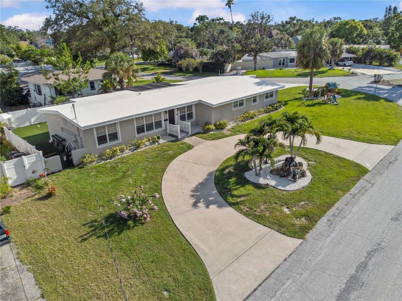 Welcome to this beautifully updated 3-bedroom, 2-bathroom home with a dedicated office and spacious 2-car garage, located in one of the most sought-after neighborhoods in Pinellas, Belleair! Sitting proudly on a large corner lot of almost a quarter acre, the home greets you with a wide circular driveway that sets the tone for the comfort and ease that follows. Step inside and you're welcomed by bright, open living spaces filled with natural light and modern design elements. Luxury vinyl plank flooring guides you from room to room as the living area flows effortlessly into the heart of the home, a stunning gourmet kitchen designed for both everyday living and memorable gatherings. Quartz countertops, a classic subway tile backsplash, sleek stainless appliances, and a stainless steel vent hood give this space a clean and timeless feel. The primary suite offers a sense of calm at the end of the day with its oversized walk-in closet and beautifully remodeled bathroom featuring a floor-to-ceiling tiled walk-in shower with frameless barn-style glass doors. Two additional bedrooms and a separate office provide room to grow, create, and settle in comfortably. Step outside and discover a backyard made for easy living. The vinyl-fenced yard wraps around a tranquil rock waterfall fountain, a screened porch, and freshly graded, maintenance-free turf that keeps weekends free for barbecues, family time, or simply unwinding in the sunshine. Set on a quiet street in a non-flood, non-evacuation zone, this home places you moments from the Belleair Country Club and Pelican Golf Club, with the world-famous Clearwater beaches just a short drive away. This is a place where everyday living feels a little more special.