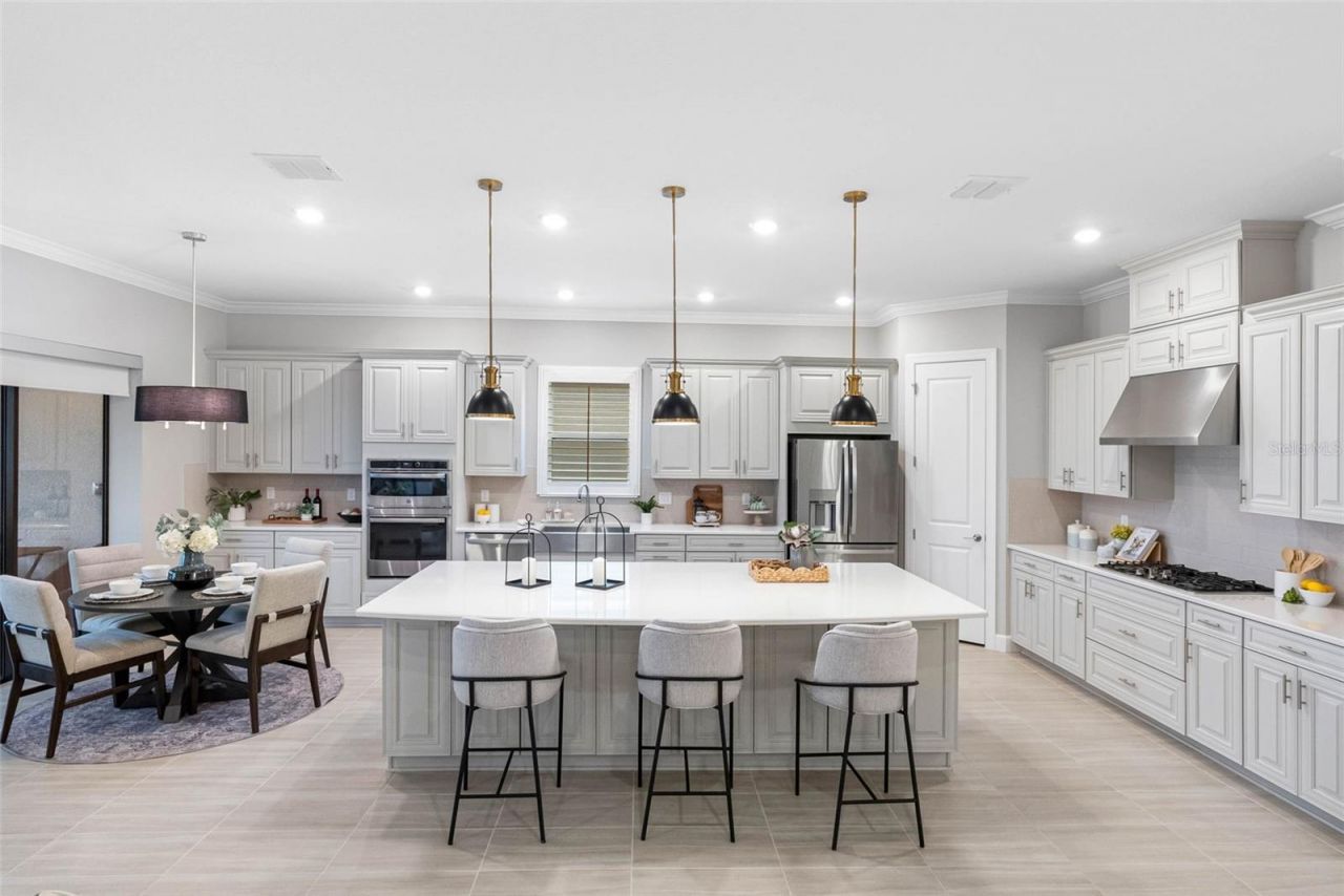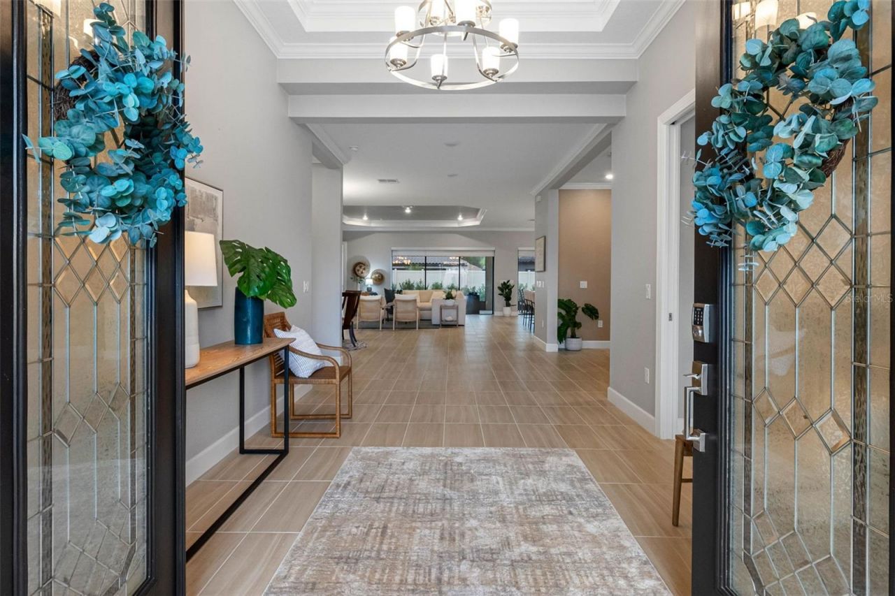 Embrace the luxury of resort-style living in this Taylor Morrison-built Pallazio model located in the gated 55+ community of Esplanade at Wiregrass Ranch. This Mediterranean-inspired home offers 3 bedrooms, 3 bathrooms, and 3,087 square feet of beautifully designed living space. From the moment you enter through the courtyard's wrought-iron gate and the striking glass double front doors, you'll be greeted by elegance and attention to detail throughout. Inside, crown molding, 8-foot doors, and tile flooring flow seamlessly across the open-concept layout. The great room features a custom media wall with TV mount and electric fireplace, creating a warm and inviting atmosphere. Electric blinds on the sliding glass doors open to the extended covered patio, offering panoramic screening, ceramic tile flooring, and pre-plumbing for an outdoor kitchen-ideal for entertaining or relaxing outdoors. The gourmet kitchen is a chef's dream, showcasing top-of-the-line cabinetry, quartz countertops, stainless steel appliances, and a gas cooktop with stainless vent hood. A spacious island with pendant lighting opens to the great room and dining area, perfect for gatherings. The primary suite serves as a private retreat with tray ceilings, a custom closet system, and a spa-inspired bath featuring an oversized glass-enclosed shower and dual vanities. The flex room off the foyer is ideal for an office or reading area. Two guest bedrooms are thoughtfully positioned on opposite sides of the home-one with private bath access and the other an ensuite. All bathrooms continue the luxurious theme with matching quartz surfaces and upscale finishes. Additional highlights include plantation shutters, a large laundry room with built-in cabinets and sink, and a two-car garage. Paver driveway and walkway, paired with lush landscaping, enhance the home's pristine curb appeal. Residents of Esplanade at Wiregrass Ranch enjoy an exceptional 55+ lifestyle with resort-style amenities, wellness programs, and endless opportunities for recreation and connection. Live every day to the fullest in a community designed to invigorate the mind, body, and spirit.