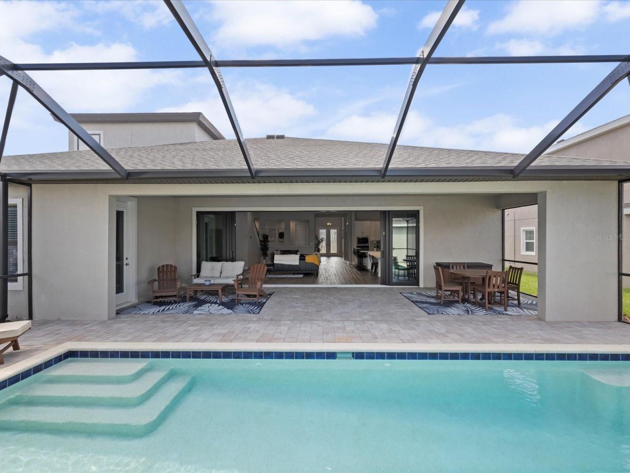This deal just got better....PRICE REDUCED BY OVER $25K! Highly upgraded WestBay Bayshore II priced at $899,999 to reflect a true finished-home comparison to new construction, with over $100K in builder upgrades already completed. This 4-bedroom, 4-bath home also includes a private office and an upstairs bedroom, full bath, and bonus loft, offering flexibility and function well beyond a standard 4/4. A custom-built heated saltwater pool and spa, completed less than one year ago, anchors the home's resort-style indoor-outdoor living experience. The home has been lightly lived in and meticulously maintained.Soaring first-floor ceilings and custom wood beams across the living and dining areas create immediate architectural impact. The open-concept layout flows into a chef's kitchen featuring Sonoma Linen cabinetry, Calacatta Novello quartz countertops, stainless steel appliances including the refrigerator, an oversized extended island with integrated table seating, and luxury plank flooring throughout the main living areas. The kitchen also includes upgraded extended cabinetry and countertop space ideal for a coffee or beverage bar, with both upper and lower cabinets thoughtfully placed around the window, adding everyday functionality and visual balance.An upgraded 24-foot sliding glass door system spans the entire back wall, opening to an upgraded extended covered lanai that stretches the full width of the home, creating a seamless connection between the interior living spaces and the outdoors-ideal for entertaining and everyday living.A private office with double-door entry and tray ceiling provides a refined work-from-home or flex space, while the upgraded extended laundry room adds convenience and storage rarely found in comparable layouts. The primary suite serves as a true retreat, featuring a tray ceiling, dual walk-in closets, private access to the pool, and a spa-inspired bath with dual sinks, a soaking tub, and a walk-in shower. A guest bedroom includes a standing walk-in shower, ideal for visitors or multigenerational living.Upstairs, the home offers a private bedroom, full bathroom, and spacious loft, creating an ideal guest suite, teen retreat, or secondary living area with separation from the main level.Outdoors, enjoy a heated saltwater pool and spa with three sheer descent waterfalls that create a soothing, resort-style sound, complemented by LED multi-color lighting. The pool is controlled via the iAquaLink system and app, fully screen-enclosed, and surrounded by pavers that extend through the expanded lanai and completely around the pool deck area, creating a cohesive, low-maintenance outdoor living space designed for year-round enjoyment.Additional upgrades include a tankless gas water heater and dual HVAC systems, roof gutters, raised AC units, and a professionally installed sump pump drainage system directing water from the backyard to the street. The oversized 3-car garage features epoxy flooring and is currently configured as a home gym with commercial-grade equipment (negotiable). The entire yard has been refreshed with new underlayment and bark landscaping throughout. Located in the Waterset master-planned community with resort-style amenities, trails, and nearby dining and retail. High and dry with no flood insurance required. Move-in ready and truly exceptional.